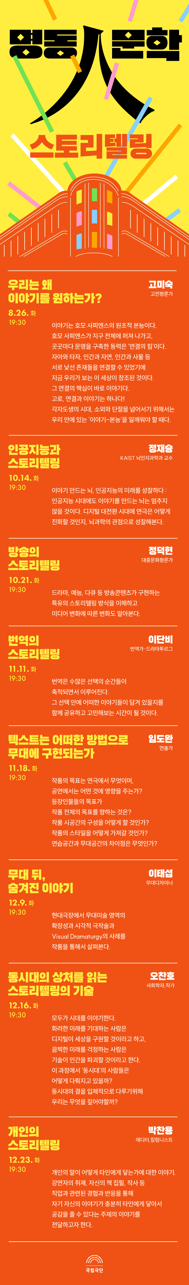 <명동人문학>은 매년 두 가지 주제를 선정하여 연극인과 관객 여러분께 창조적 영감과 인문학적 성찰을 전하는 강연 프로그램입니다. 명동예술극장의 무대가 잠시 숨을 고르는 화요일 저녁 7시 30분, 인문학 강연으로 여러분을 초대합니다.