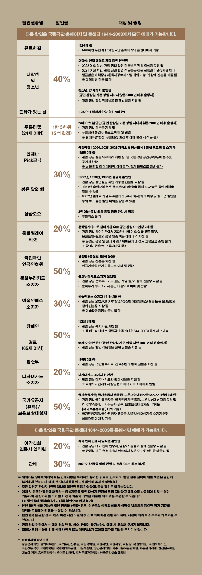 다음 할인은 국립극단 홈페이지 및 콜센터 1644-2003에서 모두 예매가 가능합니다. |