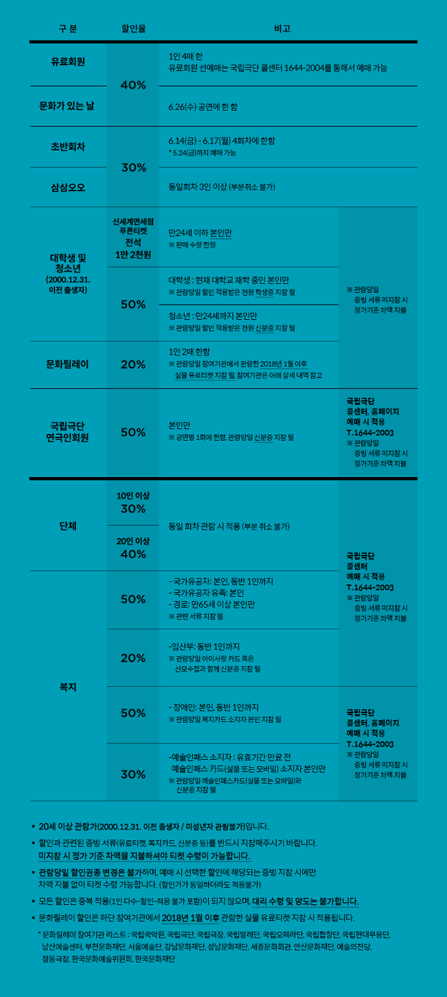 국립극단 콜센터, 홈페이지 예매 시 적용 T.1644-2003 ※ 관람당일 증빙 서류 미지참 시 정가기준 차액 지불