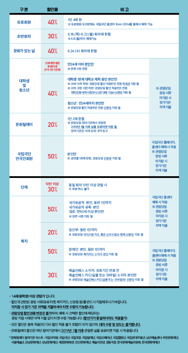 국립극단 홈페이지, 콜센터 1644-2003 예매 시 적용