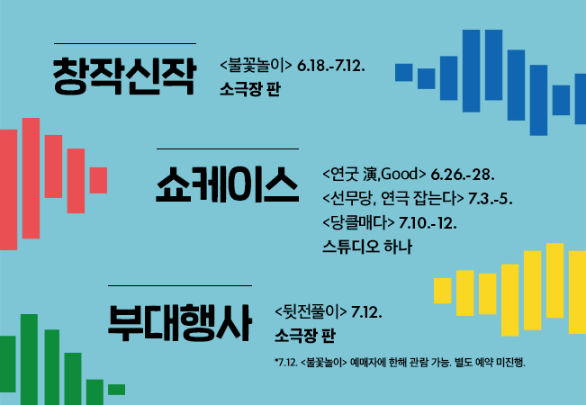 전통연희에 판소리까지 관객들의 오감을 사로잡았던 무대는 올해도 계속된다. 24절기 중 태양이 높아지고 낮이 길어지면서 여름의 문턱으로 들어서는 시기인 하지(夏至)를 맞이하며 펼쳐지는 2020년 ‘우리 연극 원형의 재발견’은 지금까지와는 전혀 다른 새로운 모습으로 관객들을 기다린다. 이름부터 즐거운 기운이 넘쳐나는 <하지맞이 놀굿풀굿>이라는 주제로 김민정 작, 남인우 연출의 창작신작 <불꽃놀이>와 더불어 배우(문민형), 연희자(김솔지), 미디어아티스트(고동욱)의 과감한 실험이 돋보이는 3인 3색의 쇼케이스를 선보인다.