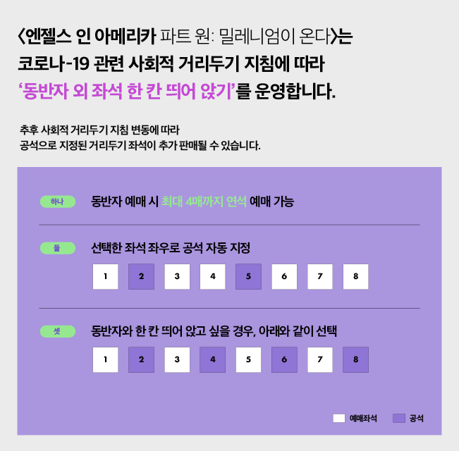 본인, 동반 1인까지 - 1차 접종자도 가능 - 관람당일 ‘예방접종내역확인서+신분증’ 혹은 ‘앱(COOV)확인서+신분증’ 지참 필 ※ 반드시 백신 접종자 본인 이름(아이디)로 직접 예매, 양도 및 대리 수령 불가 |