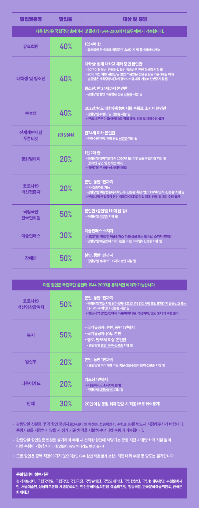 다음 할인은 국립극단 홈페이지 및 콜센터에서 모두 예매가 가능합니다.