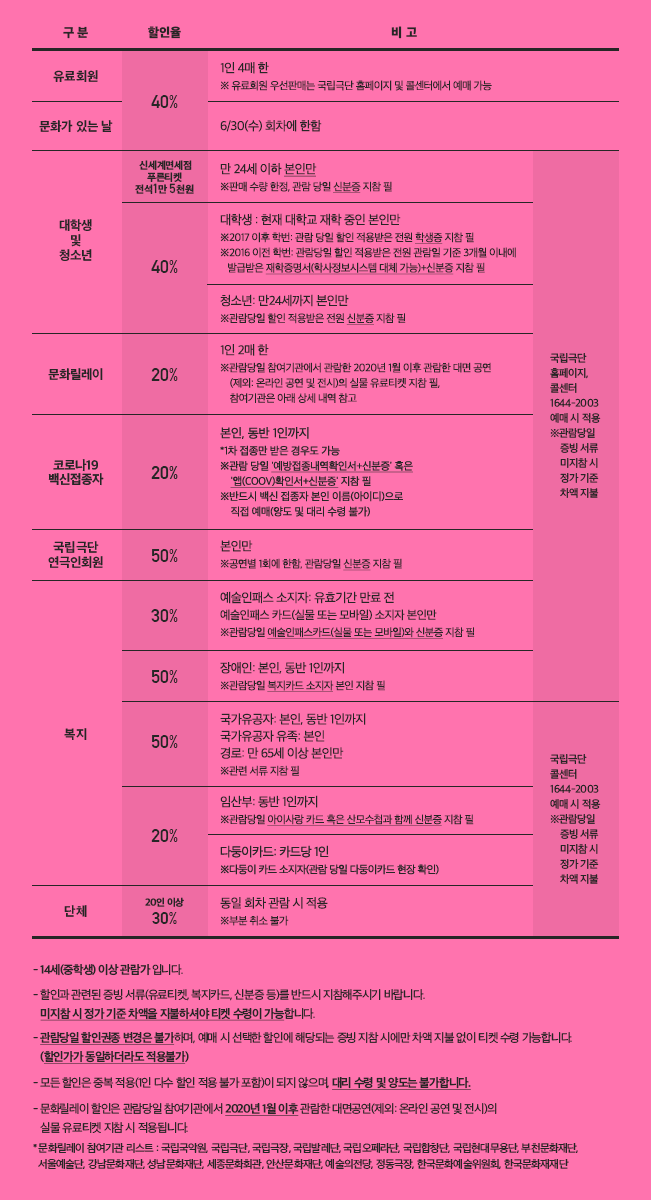 국립극단 홈페이지, 콜센터 1644-2003 예매 시 적용