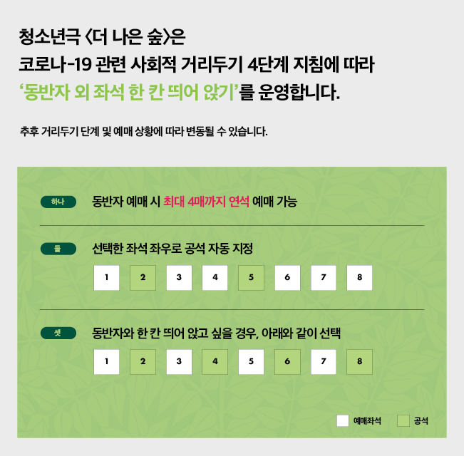 ※동반자 외 좌석 한 칸 띄어 앉기 시범운영(4매 연석구매 가능) -