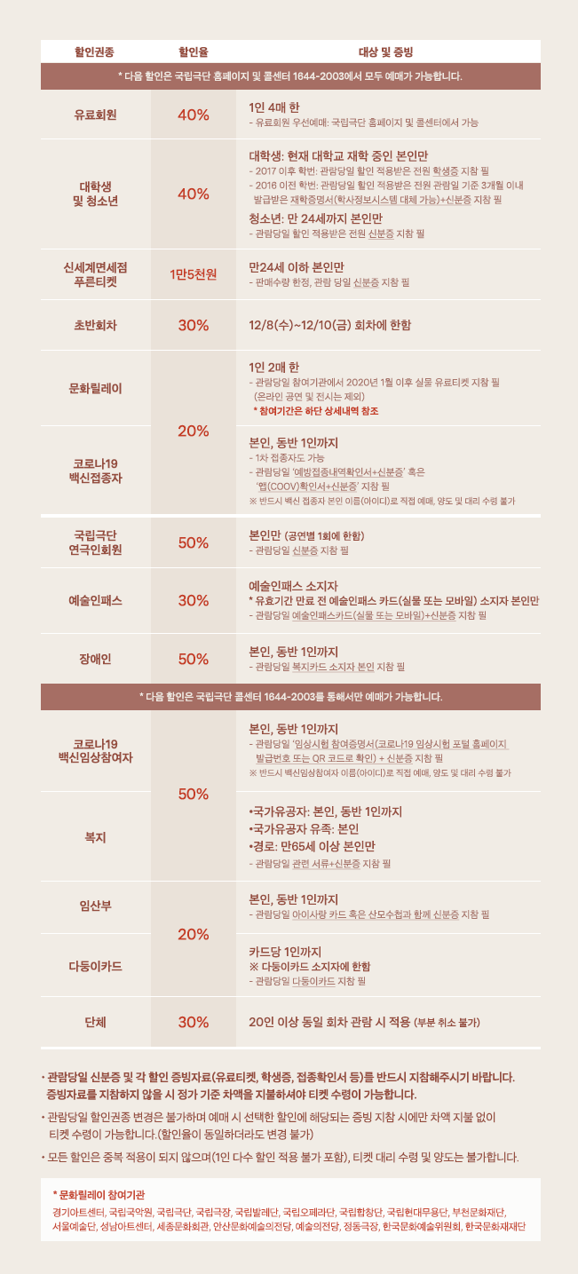 다음 할인은 국립극단 홈페이지 및 콜센터 1644-2003에서 모두 예매가 가능합니다.