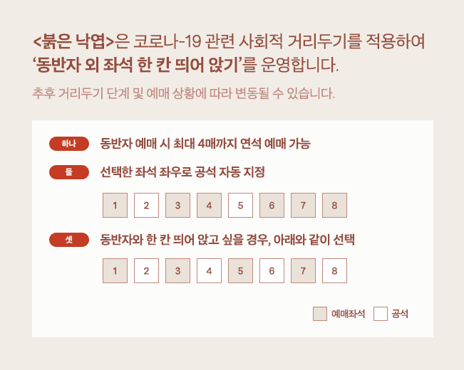 본인, 동반 1인까지 - 1차 접종자도 가능 - 관람당일 ‘예방접종내역확인서+신분증’ 혹은 ‘앱(COOV)확인서+신분증’ 지참 필 ※ 반드시 백신 접종자 본인 이름(아이디)로 직접 예매, 양도 및 대리 수령 불가 |