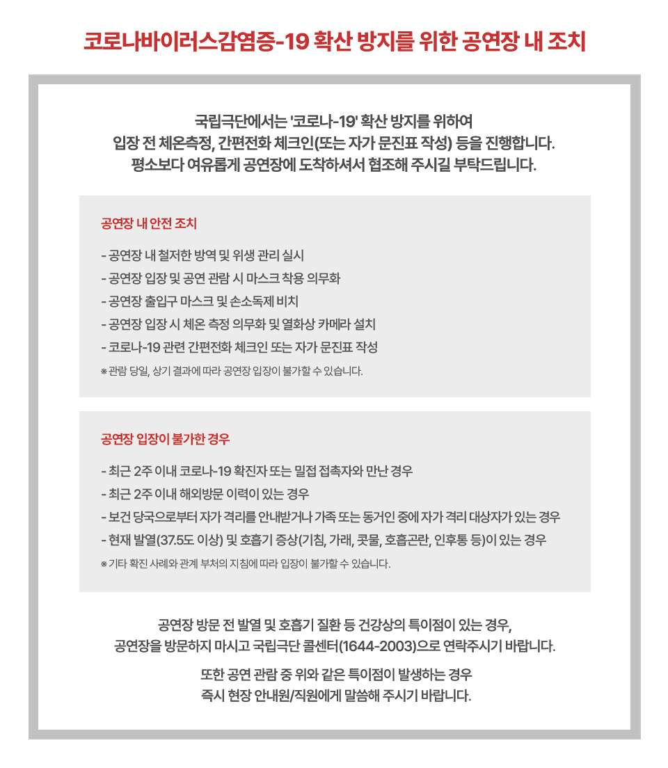 국립극단에서는 '코로나-19' 확산 방지를 위하여 접종증명 및 음성확인제(방역패스), 입장 전 체온측정, 간편전화 체크인(또는 문진표 작성) 등을 진행합니다. 평소보다 여유롭게 공연장에 도착하셔서 협조해 주시길 부탁드립니다.