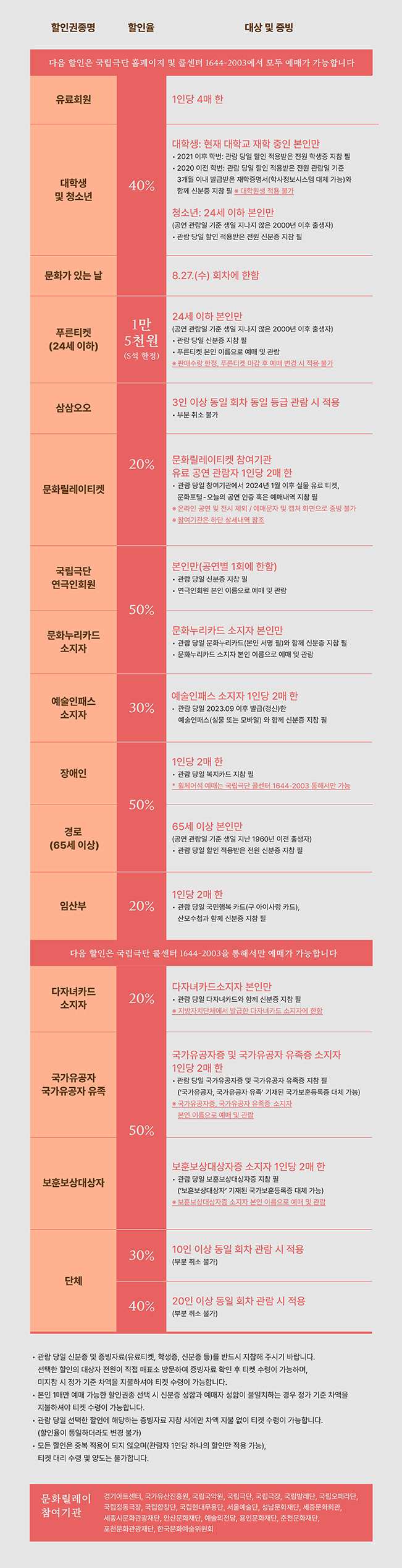 다음 할인은 국립극단 홈페이지 및 콜센터 1644-2003에서 모두 예매가 가능합니다. |