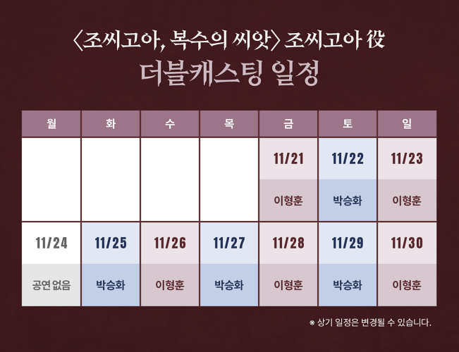 - 조씨고아 役은 이형훈 배우와 박승화 배우가 교차로 출연합니다. 예매 및 관람에 참고 부탁드립니다.