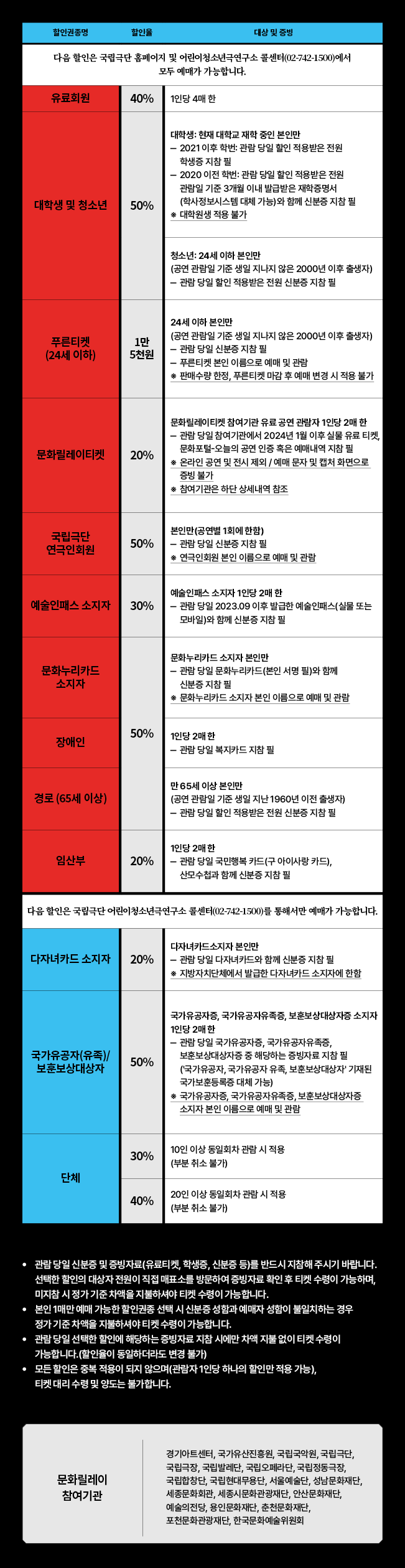 국립극단은 공연에 대한 다양한 정보를 더욱 많은 관객 분들과 나누고자 홈페이지에서 공연 프로그램을 무료로 제공하고 있습니다. (2018년 9월 1일 이후) 공연 프로그램 다운로드 공연 포스터 다운로드 공연 교육자료 다운로드