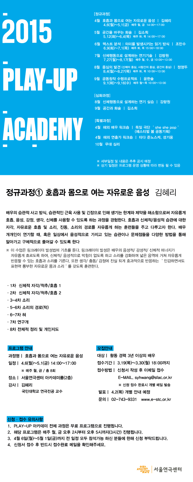 서울연극센터에서는 [2015 PLAY-UP 아카데미] 정규과정① 호흡과 몸으로 여는 자유로운 음성(김혜리) 참가자를 모집합니다. 관심있는 분들의 많은 지원 바랍니다! :-)