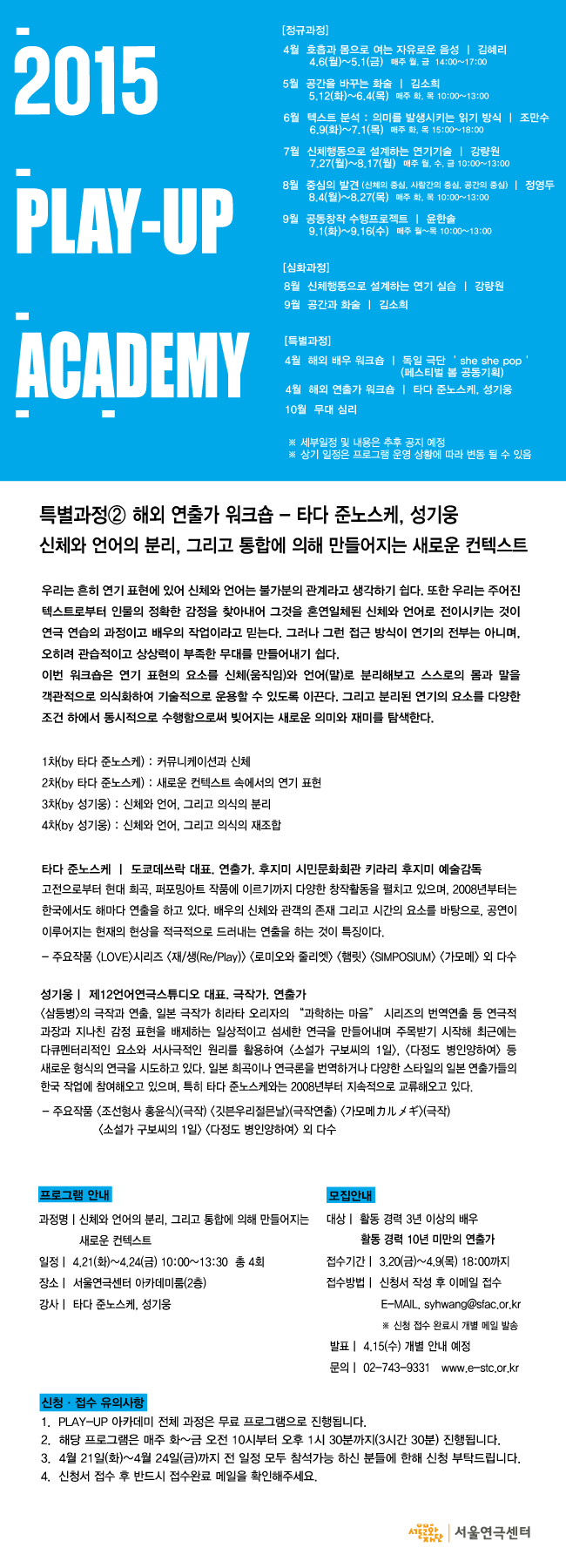 - 2015 서울연극센터 PLAY-UP 아카데미 특별과정② 해외 연출가 워크숍 - 타다 준노스케, 성기웅 참가자 모집