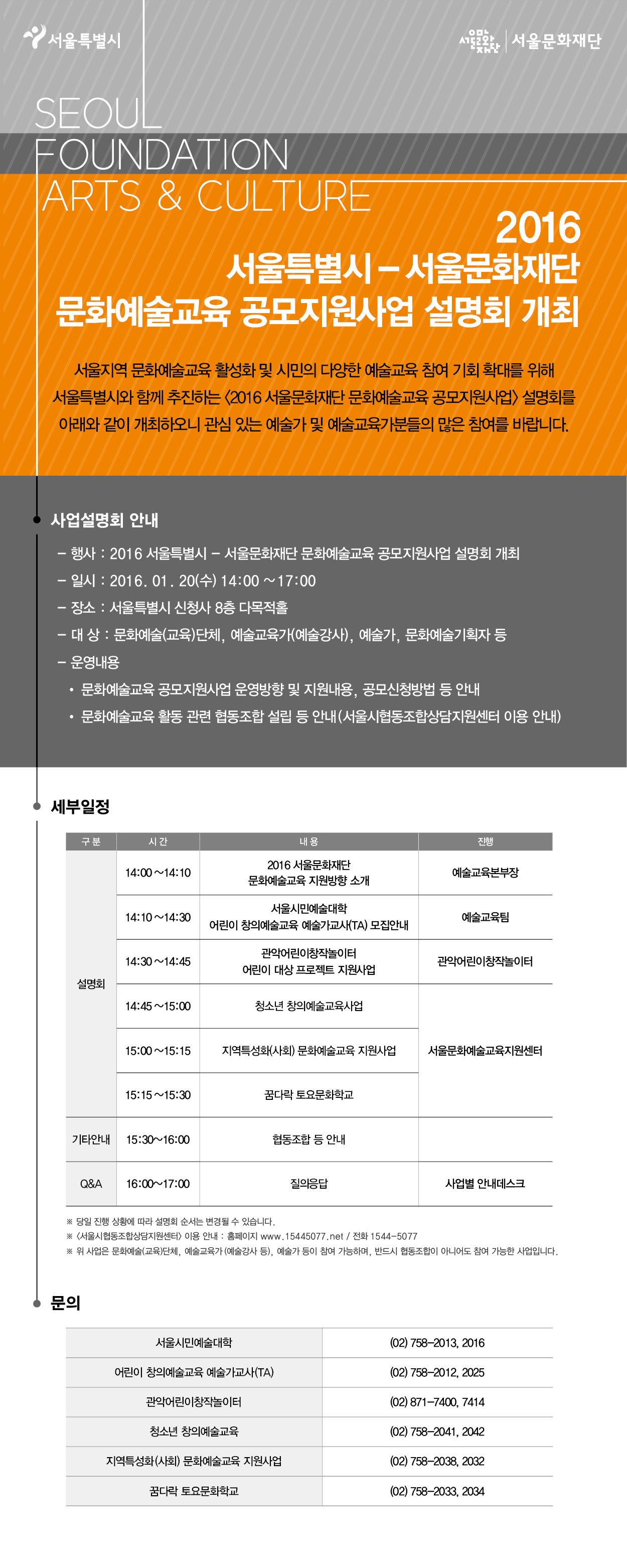 2016 서울문화재단 문화예술교육 공모지원사업 설명회를 개최합니다.