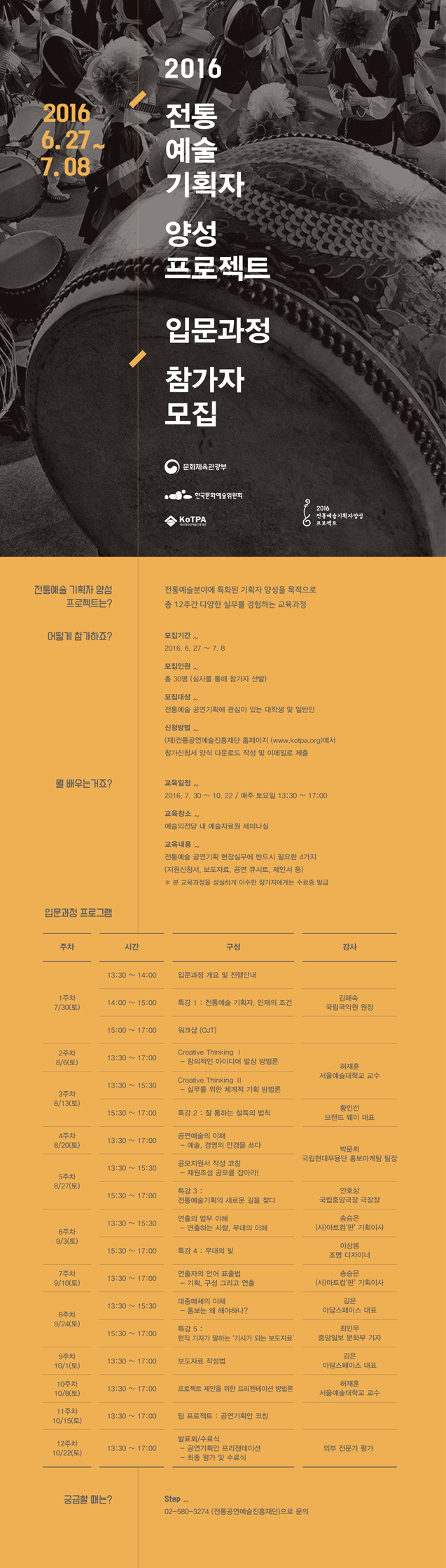 기획자, 전통을 만들다! 2016 전통예술기획자양성프로젝트 [입문과정] 참가자 모집 안내