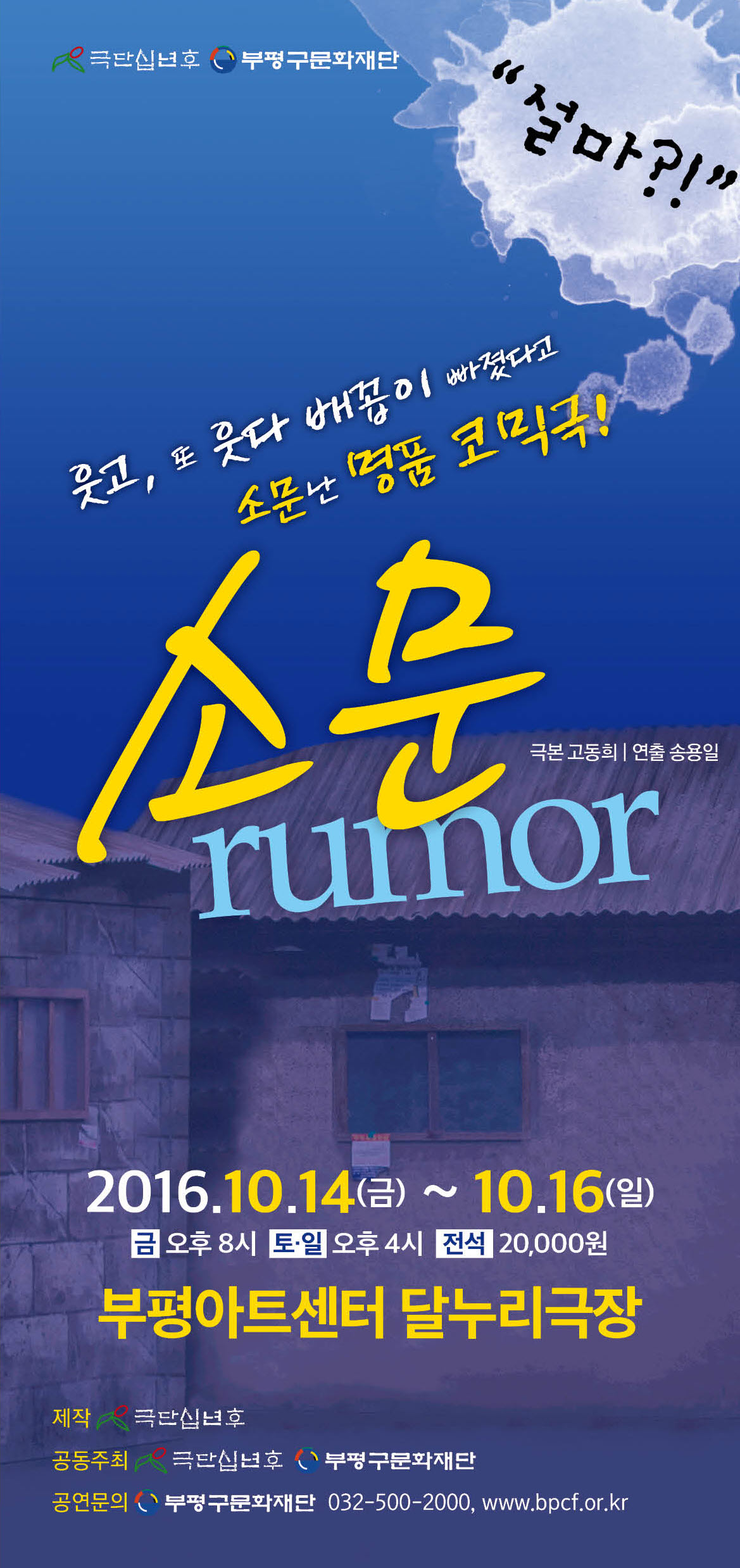 중국과 일본 그리고 연극의 메카 서울 대학로를 강타하고 온 연극 <소문> 전보다 더 짜임새 있는 스토리와 새로운 캐스팅으로 돌아왔습니다. 말도 많고 탈도 많은 이 시대, 진정 필요한 '소문'은 무엇일까요? 무심코 던진 말 한 마디가 어느새 눈덩이처럼 불어나 걷잡을 수 없는 '소문'이 되었습니다. 악성댓글과 근거 없는 억측들이 난무하는 오늘날, 진정성 없는 '소문'에 매몰되어 살아가는 우리네 모습을 돌아봅니다.