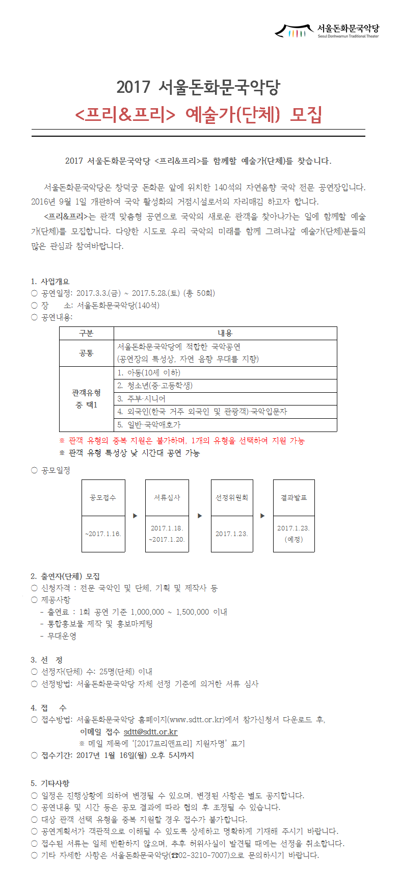 2017 서울돈화문국악당 <프리&프리> 예술가(단체) 모집