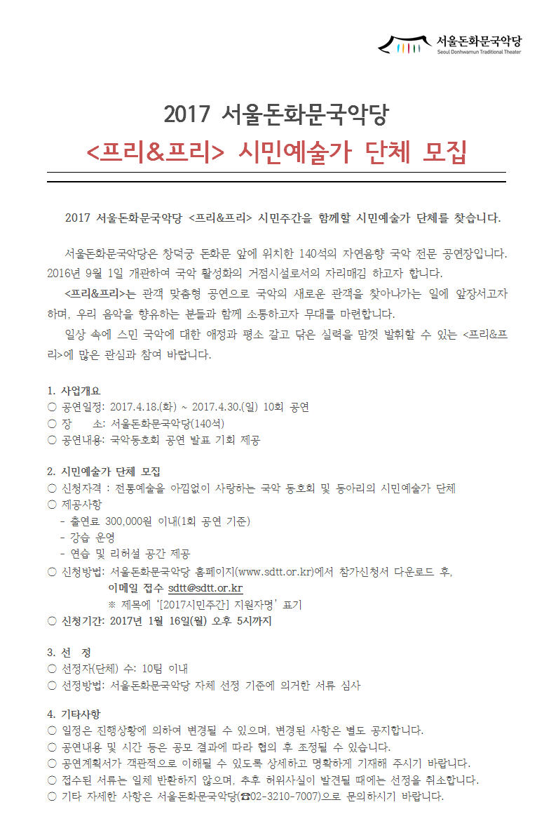 2017 서울돈화문국악당 <프리&프리> 시민예술가 단체 모집