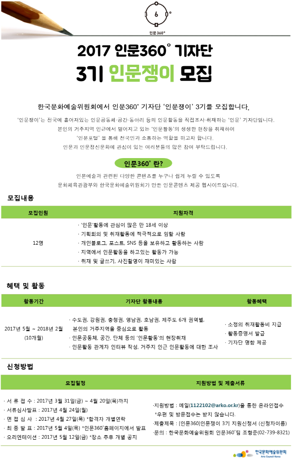 [한국문화예술위원회 인문360˚ 인문쟁이 3기 모집 (~4.20)