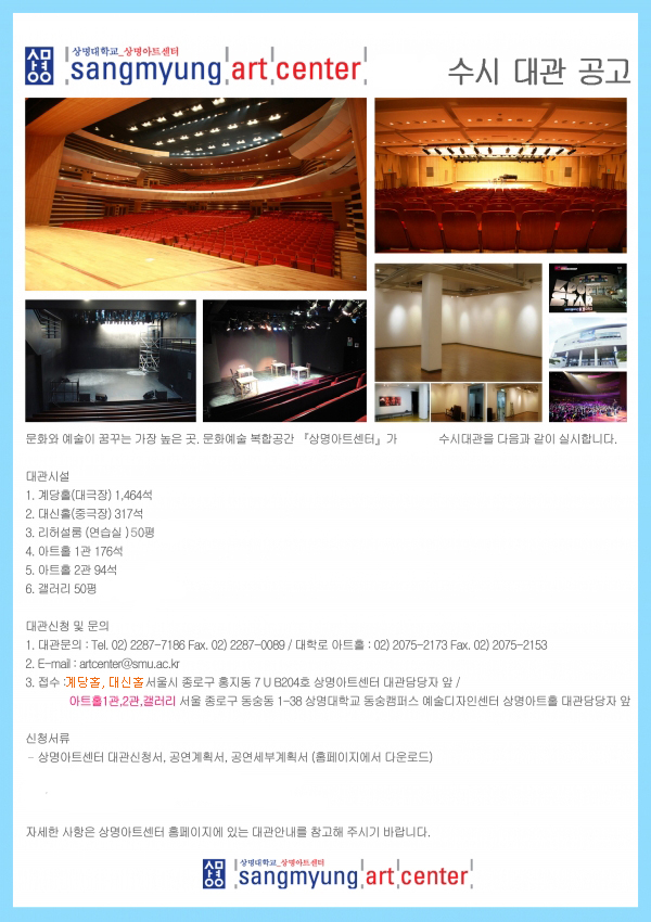 - [대관 안내] 상명아트센터, 상명아트홀 1관, 2관, 갤러리 대관 안내입니다.