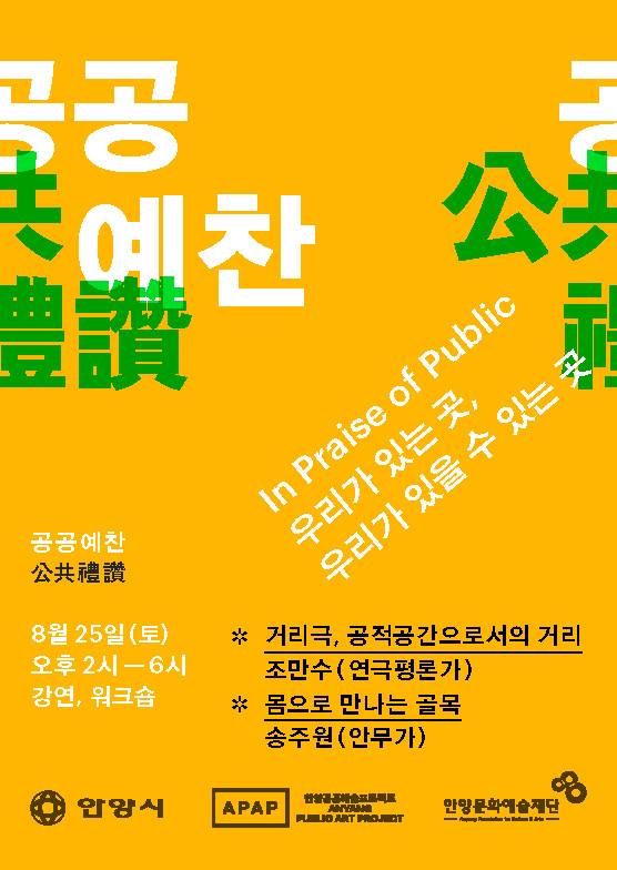 2005년부터 시작된 안양공공예술프로젝트(APAP)는 안양시내 곳곳에서 미술, 조각, 영상, 연극, 퍼포먼스 등을 시도해 왔으며, 공공예술에 관한 새로운 이슈를 담고자 노력해 왔습니다. 안양파빌리온에서 진행되는 <2018 공공예찬 公共禮讚>은 새롭게 진화하는 공공예술에 대한 이해를 돕고, 동시대 공공미술의 흐름을 탐구하며 지속적이고 능동적인 시민 참여를 도모하기 위한 목적으로 마련된 프로그램입니다.