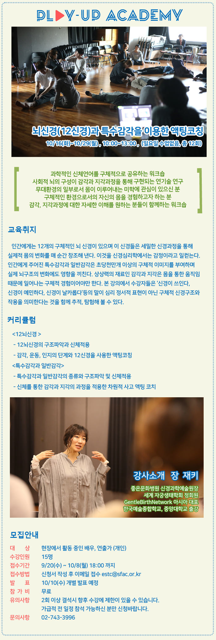 [PLAY-UP 아카데미] 뇌신경(12신경)과 특수감각을 이용한 액팅코칭(장재키) 참가자 모집 안내