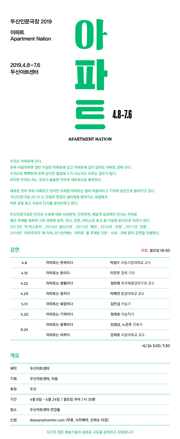 - [두산아트센터] ‘두산인문극장 2019 아파트’ 무료 인문학 강연 안내 4.8~6.24