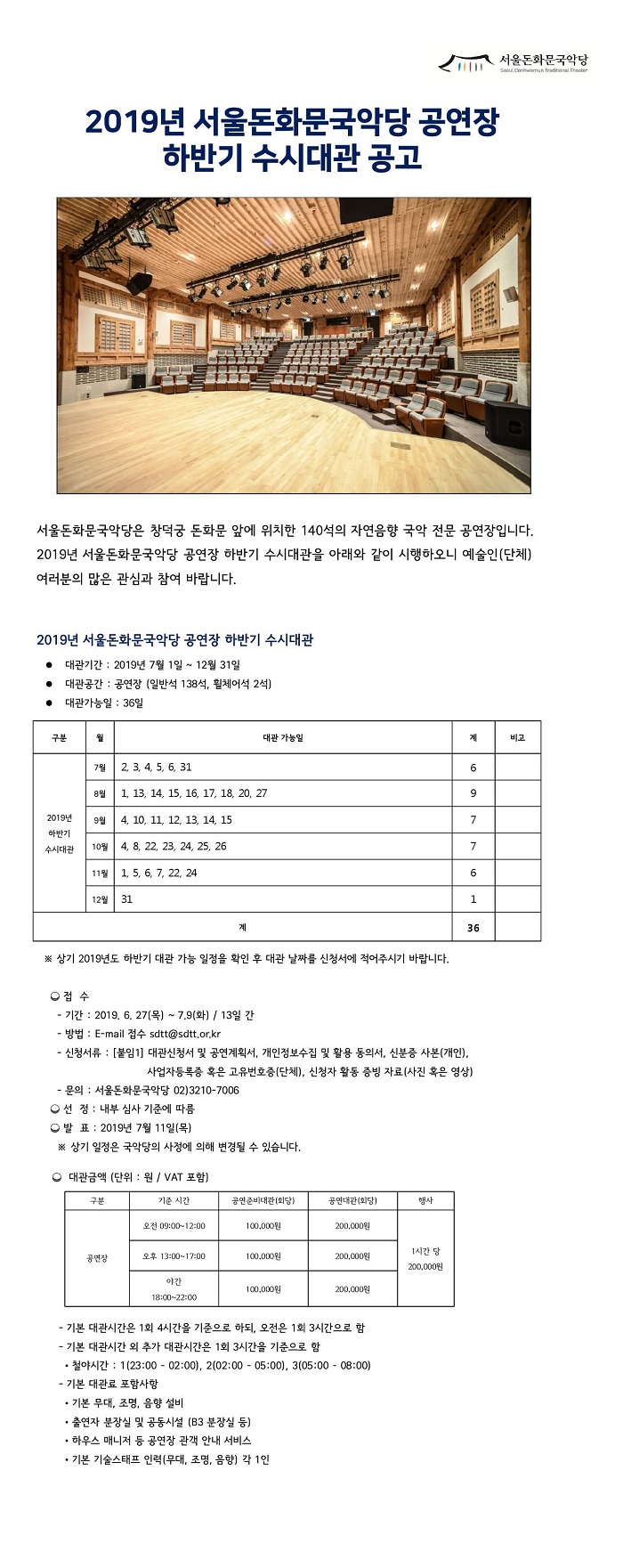 2019 서울돈화문국악당 공연장 하반기 수시대관 공고 (~07.09까지)