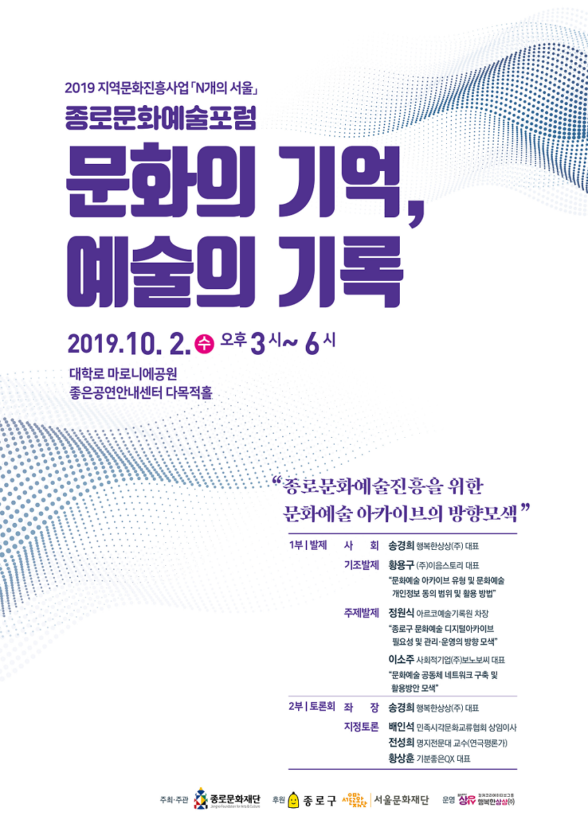 종로 문화예술 진흥을 위한 문화예술 아카이브 방향을 모색하고자 합니다.