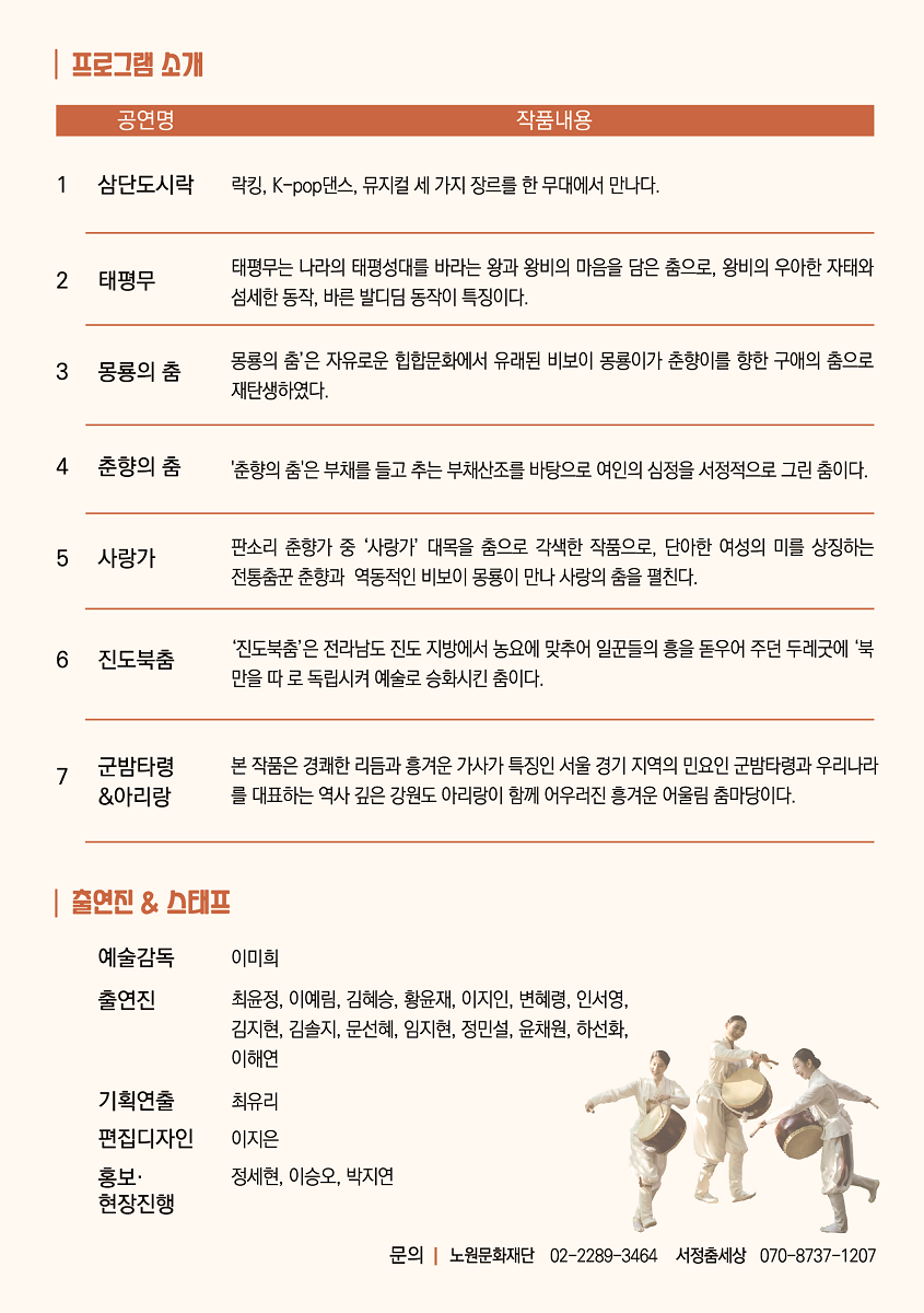 □코로나 19로 지친 노원구 지역주민들에게 신명난 춤과 음악으로 힘차고 건강한 문화생활을 향유할 수 있도록 준비하였습니다.