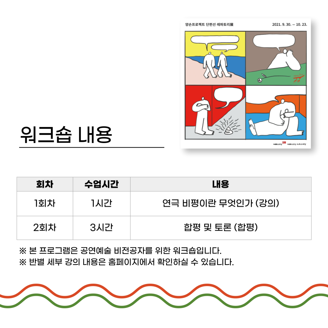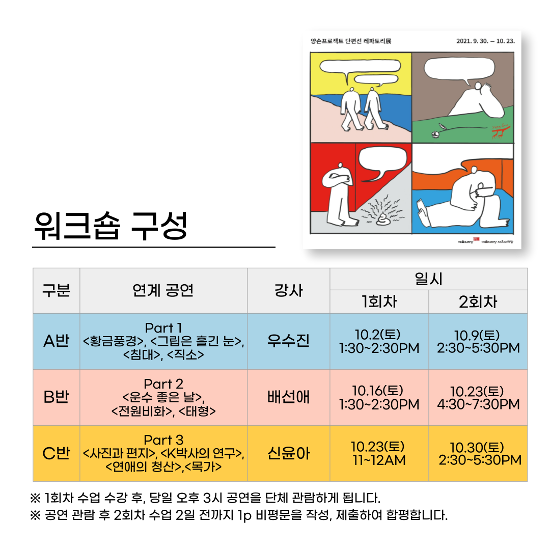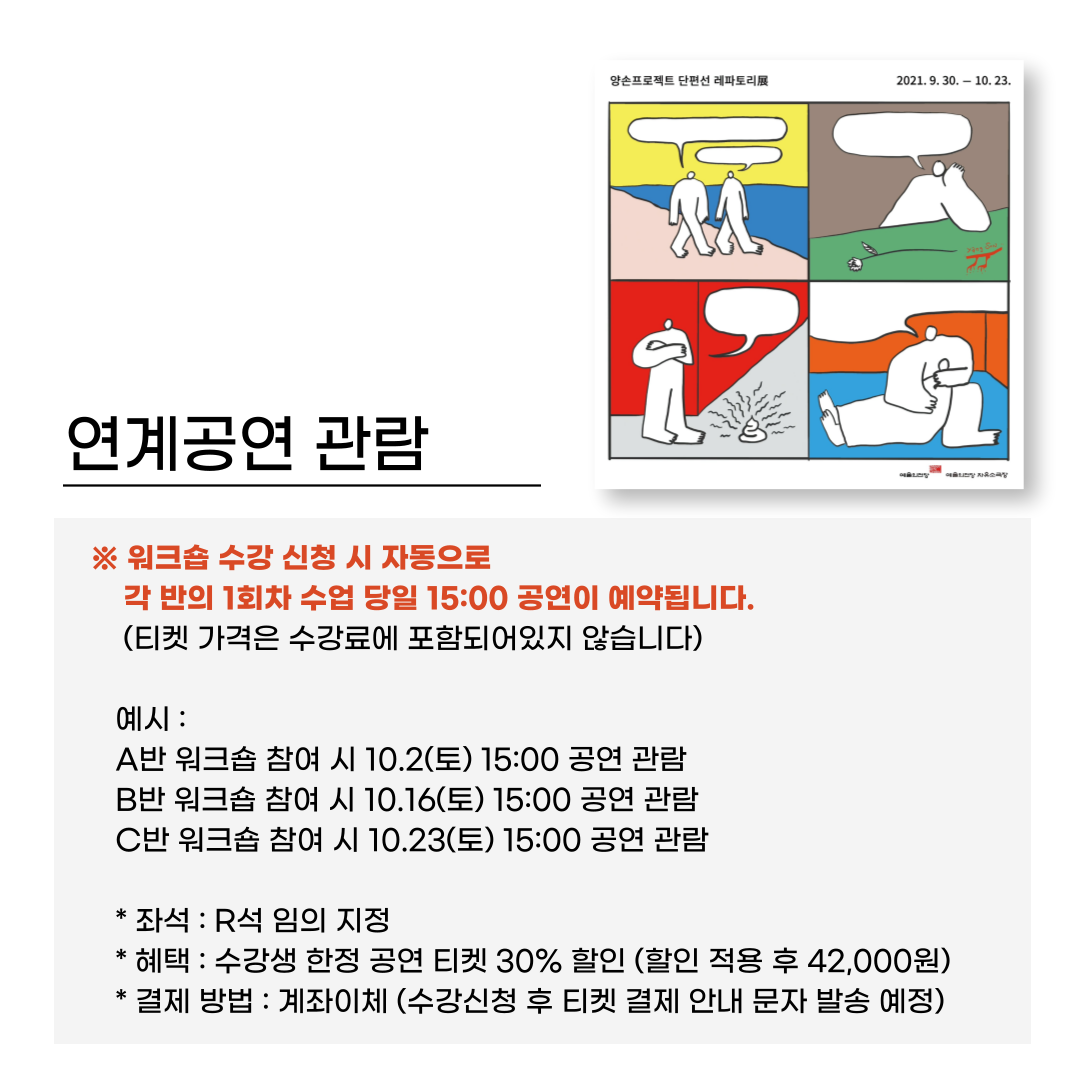 ※ 필독: 워크숍 수강 신청 시 자동으로 1회차 수업 당일 오후3시 공연이 예약됩니다. A반 관람 일정 : 2021.10.2.(토) 3PM