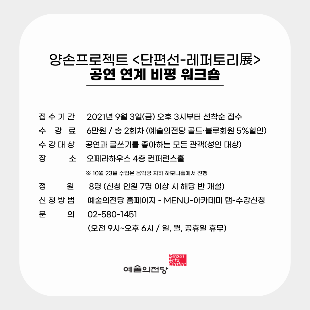 - [예술의전당] 양손프로젝트 10주년 기념 공연 <단편선-레퍼토리展> 공연 연계 비평 워크숍
