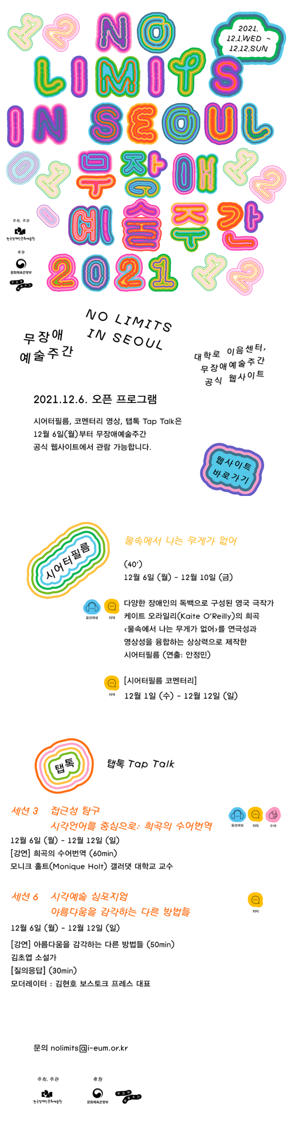 시어터필름, 코멘터리 영상, 탭톡 Tap Talk은 12월 6일(월) 오전 10시부터 무장애예술주간 공식 웹사이트에서 관람 가능합니다. http://nolimits.kr/2021/