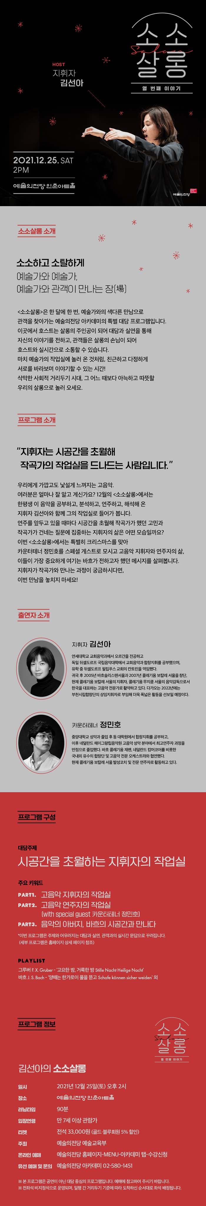 <소소살롱>은 한 달에 한 번, 예술가와의 색다른 만남으로 관객을 찾아가는 예술의전당 아카데미의 특별 대담 프로그램입니다.