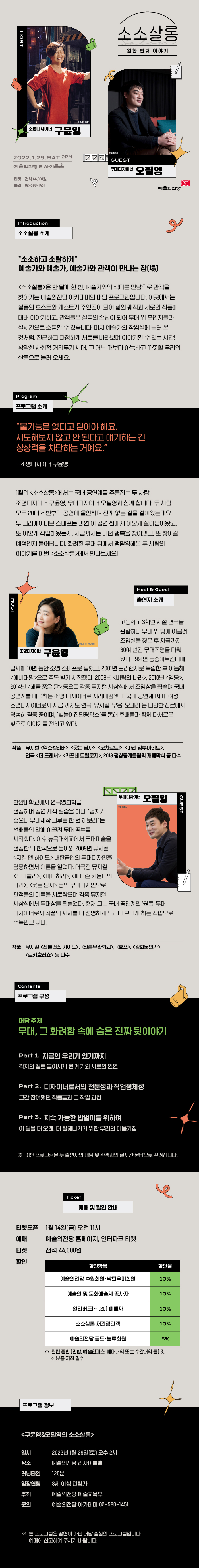 1월의 <소소살롱>에서는 국내 공연계를 주름잡는 두 사람! 조명디자이너 구윤영, 무대디자이너 오필영과 함께 합니다.