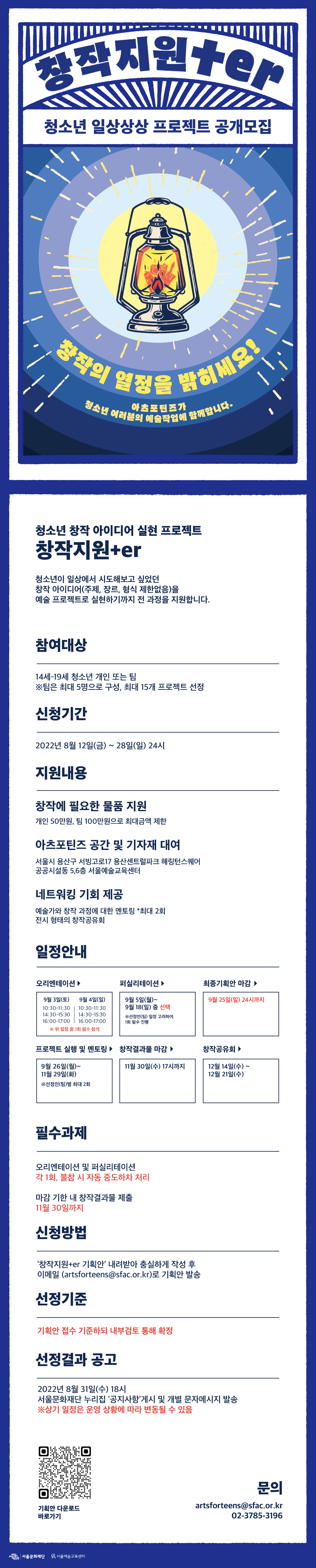 - 2022년 서울예술교육센터 청소년 일상상상 프로젝트 '창작지원+er(창작지원터)' 청소년 아이디어 모집 프로필 사진 yongsanedu 2022.08.19. 16:14조회 0