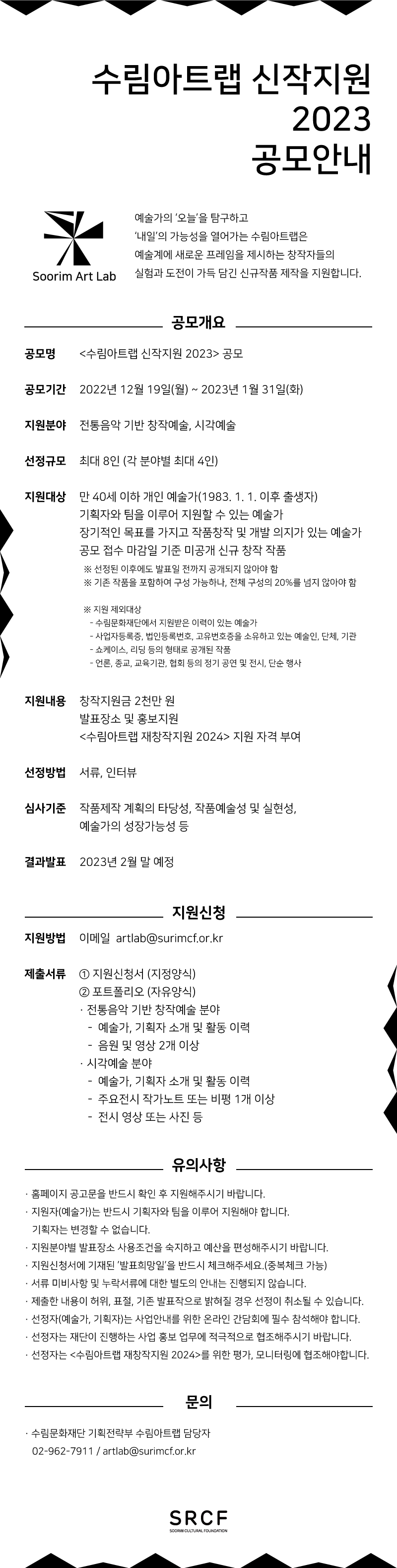 수림문화재단 <수림아트랩 신작지원 2023> 공모 (~1/31)