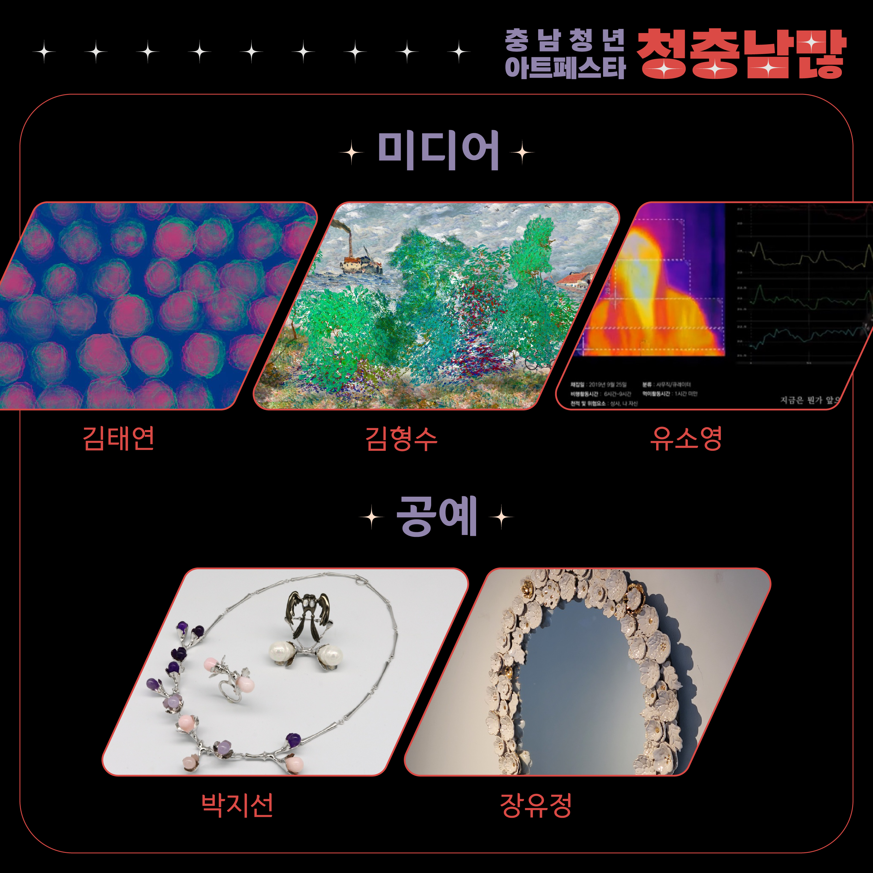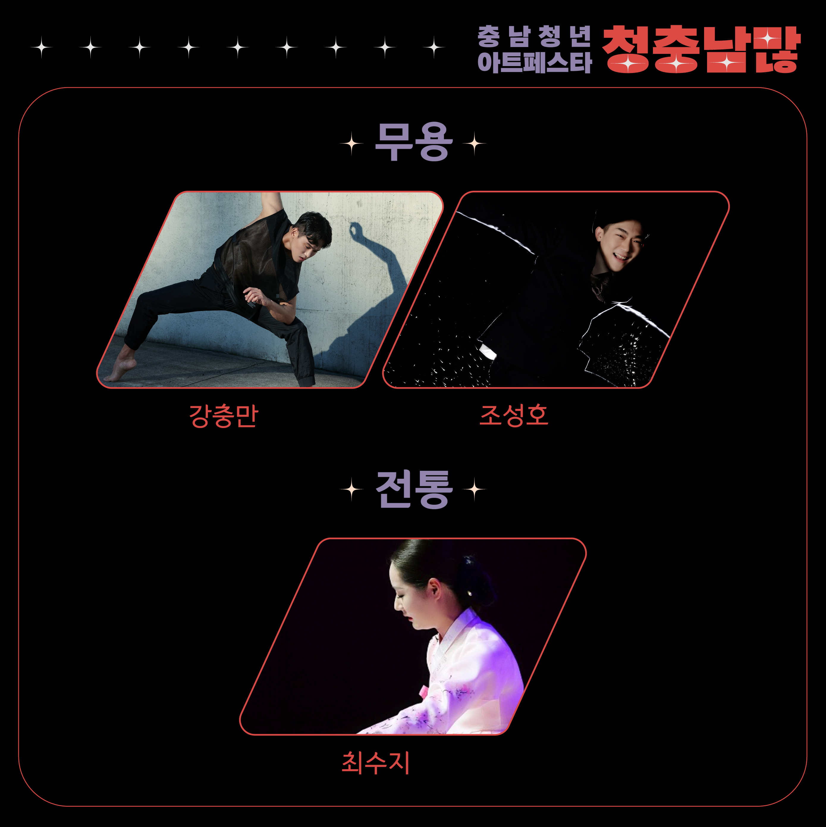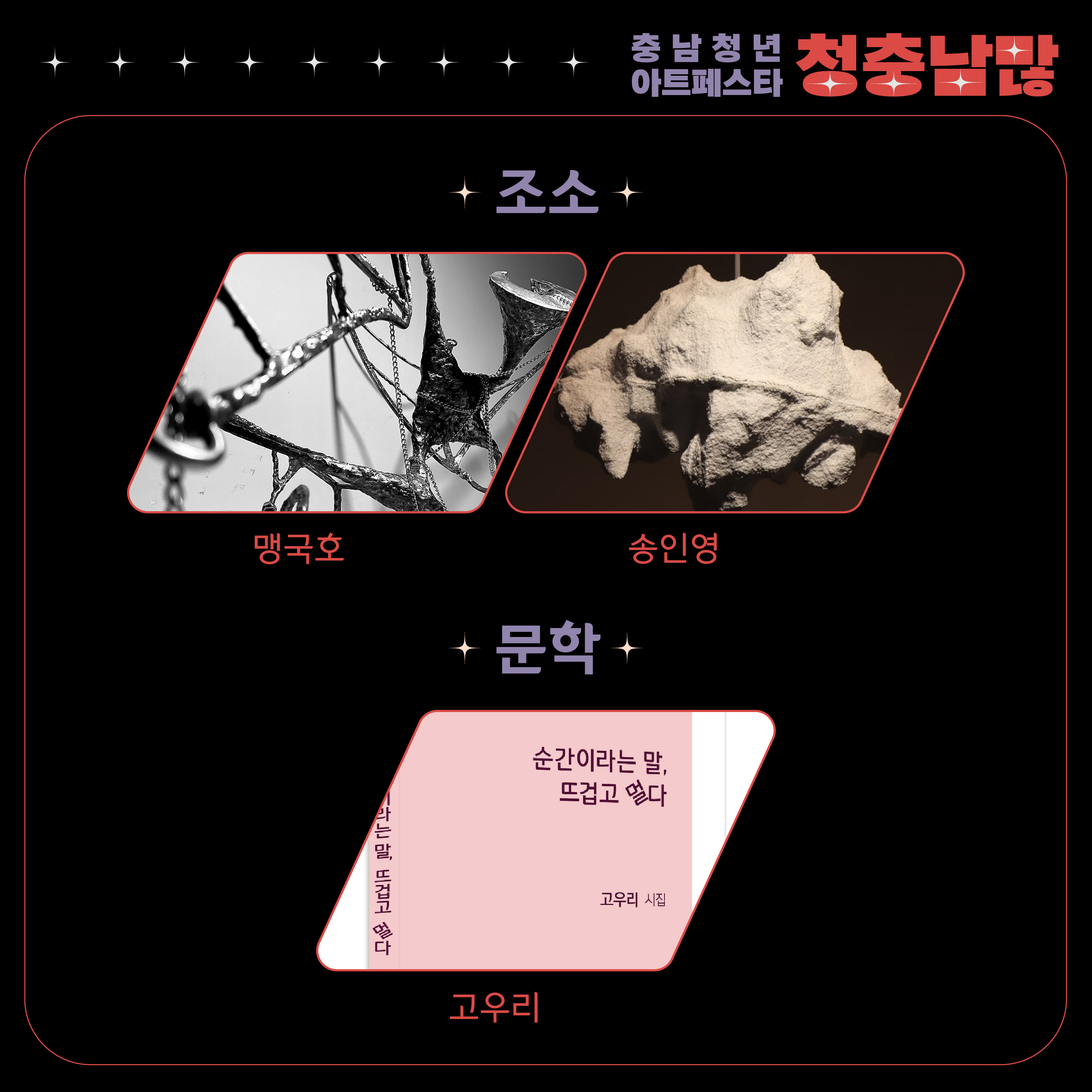 스스로 빛을 내는 충남의 청년예술가들이 준비한 ‘청충남많’을 통해 저마다의 마음 속 청춘과 낭만을 뜨겁게 확인하고 싶은 분은, 별도의 사전 예약 절차 없이 현장에서 바로 참여 가능합니다.