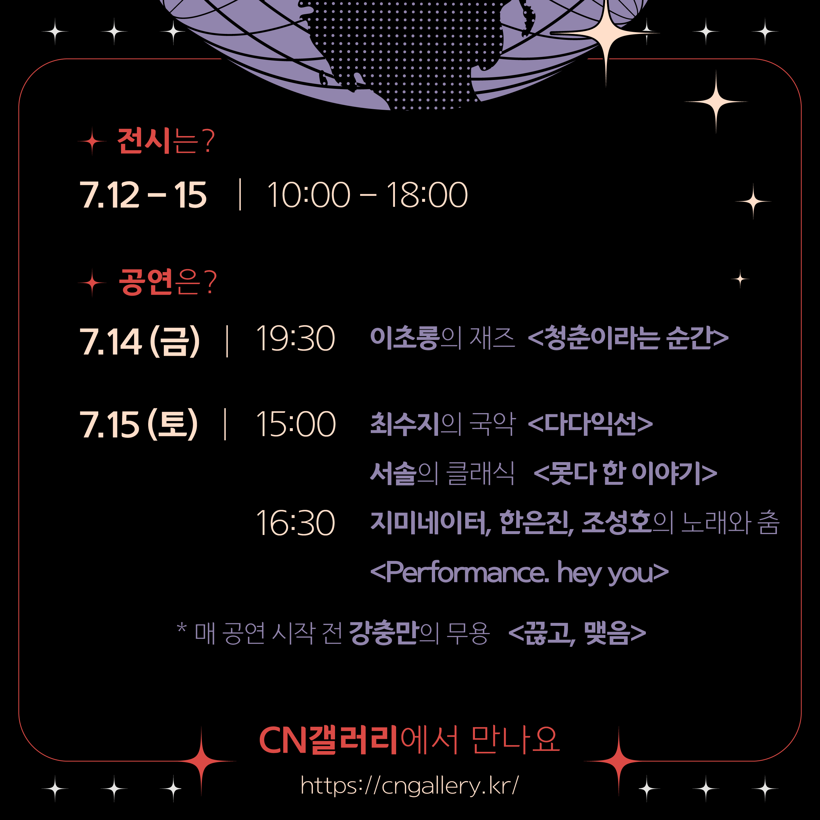 ‘청춘과 낭만의 합작 <청충남많>’을 부제로 ▲문학의 고우리 ▲회화의 공은지, 김현정, 단수민, 신소은, 오예진 ▲미디어의 김태연, 김형수, 유소영 ▲공예의 박지선, 장유정 ▲조소의 맹국호, 송인영 ▲음악의 서솔, 윤지민, 이초롱, 한은진 ▲무용의 강충만, 조성호 ▲ 전통(국악)의 최수지 등 스무 명의 청년 예술인들이 소격동의 7월을 밝힐 예정입니다.