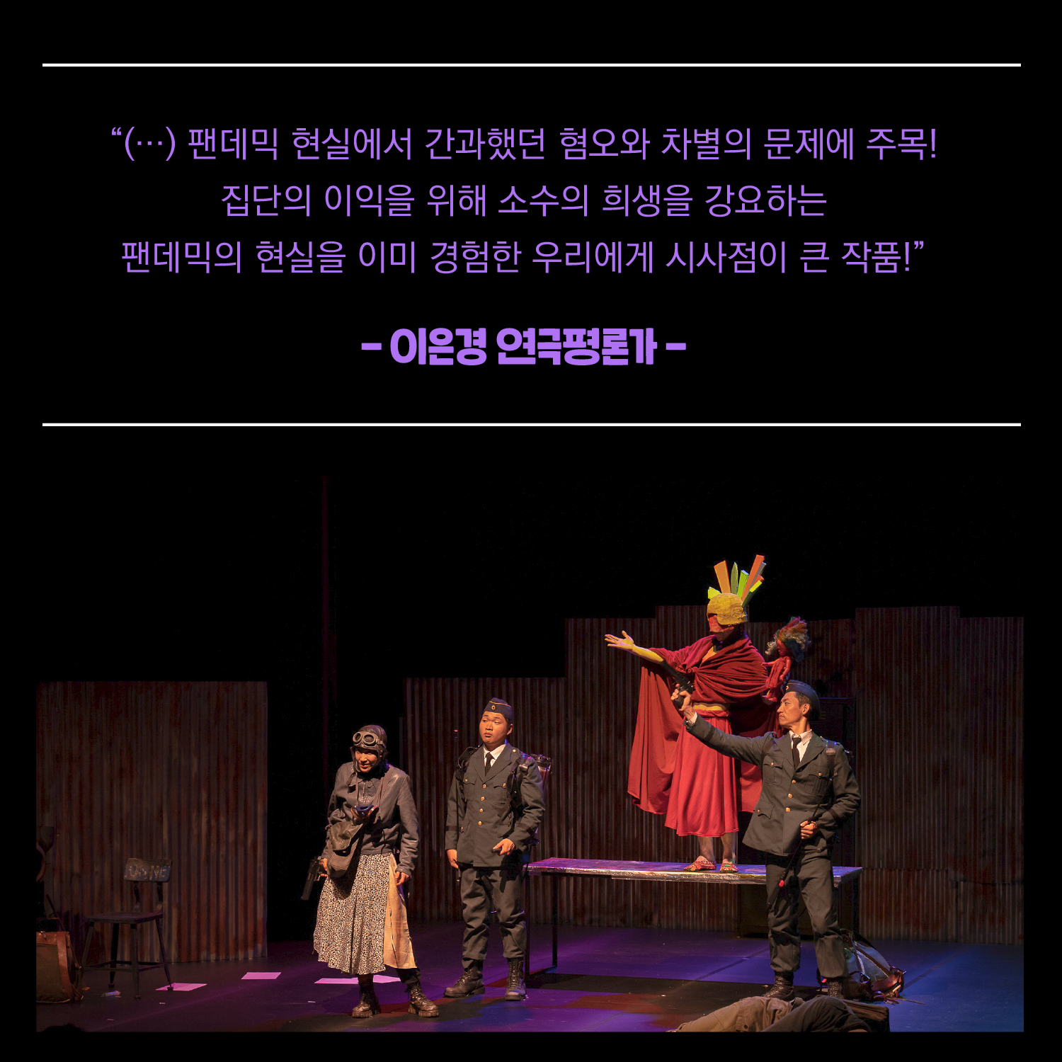 “(…) 팬데믹 현실에서 간과했던 혐오와 차별의 문제에 주목! 집단의 이익을 위해 소수의 희생을 강요하는 팬데믹의 현실을 이미 경험한 우리에게 시사점이 큰 작품!”