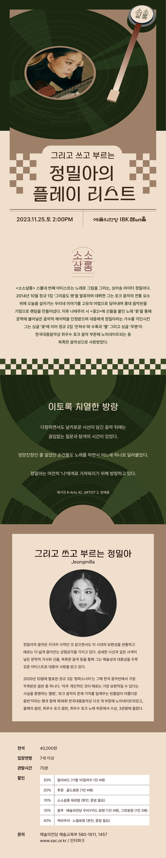 - [예술의전당] <소소살롱> 그리고 쓰고 부르는 정밀아의 플레이 리스트 (얼리버드 ~11/10) ★마지막 소소살롱★