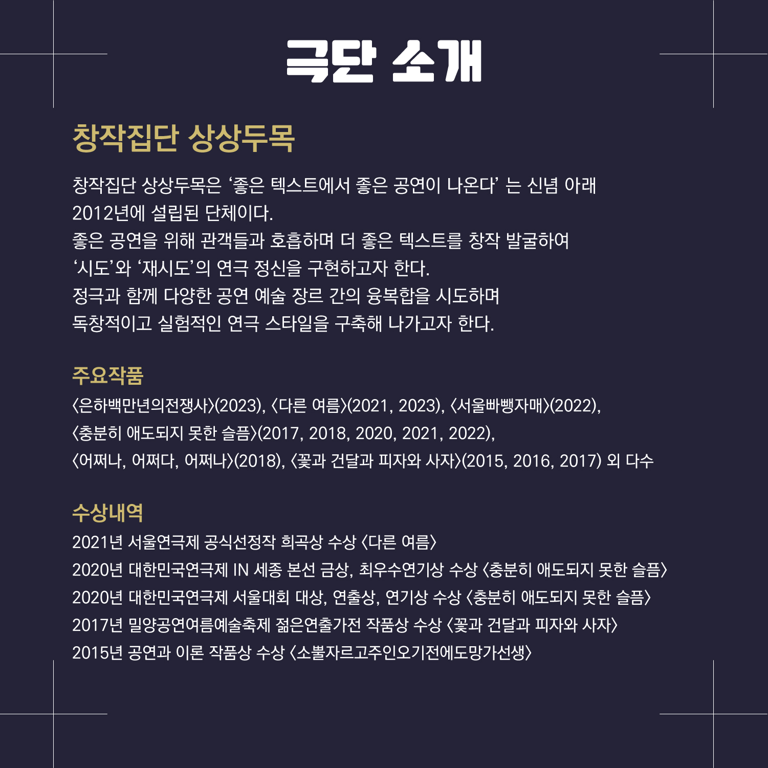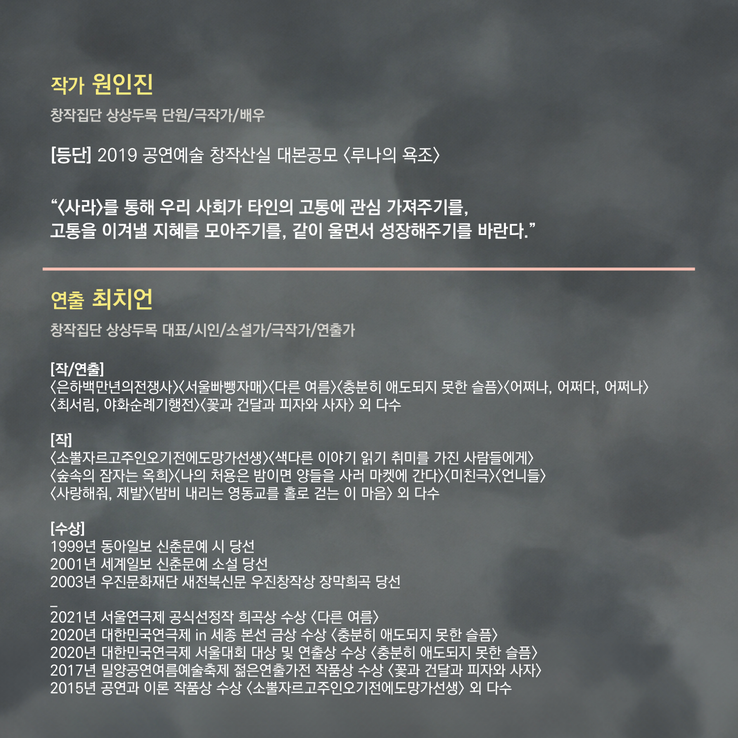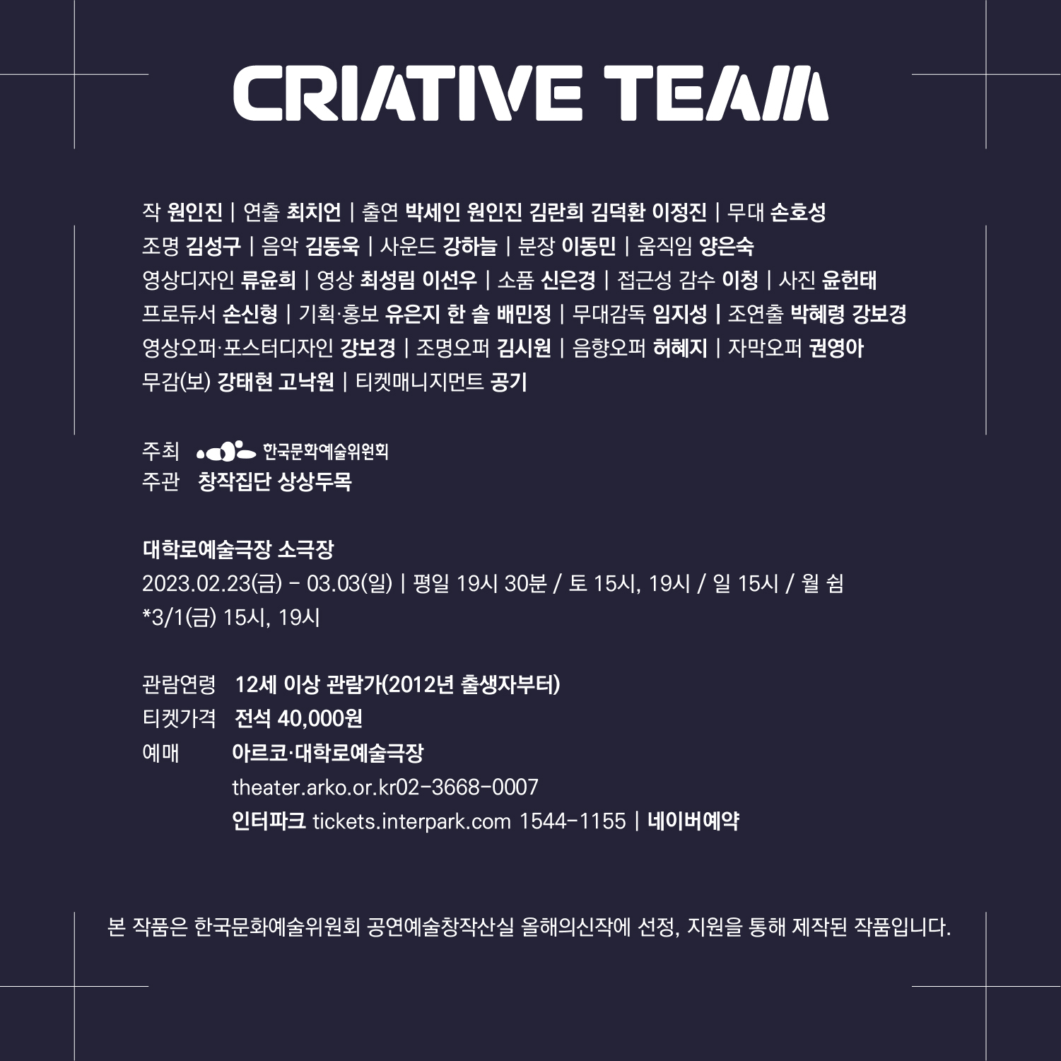 본 작품은 한국문화예술위원회 공연예술창작산실 올해의 신작에 선정, 지원을 통해 제작된 작품입니다.