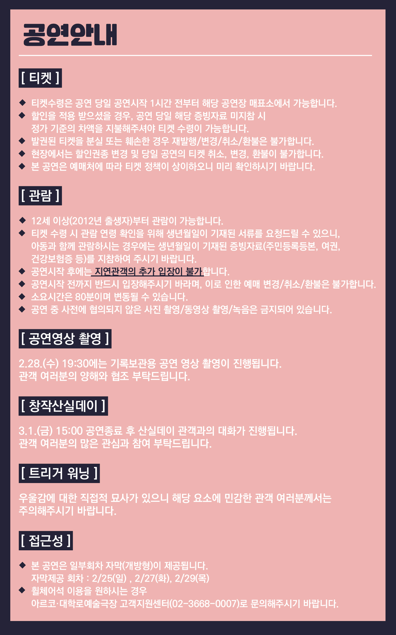 * 3.1.(금) 15:00 공연종료 후 산실데이 관객과의 대화가 진행됩니다.