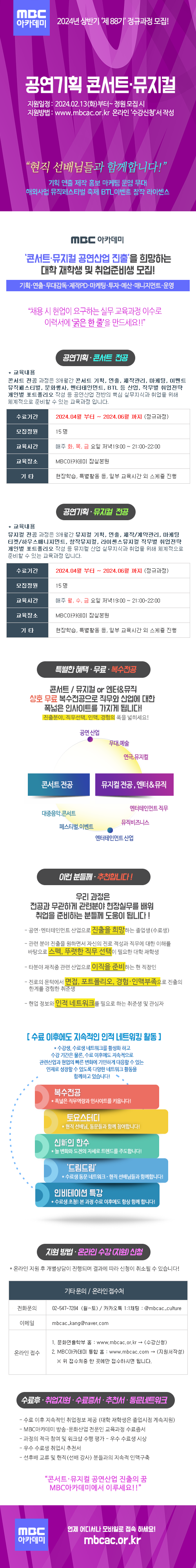 ㆍ공연기획콘서트 : 2024. 04. 04(목) 19:00 MBC아카데미 강의실