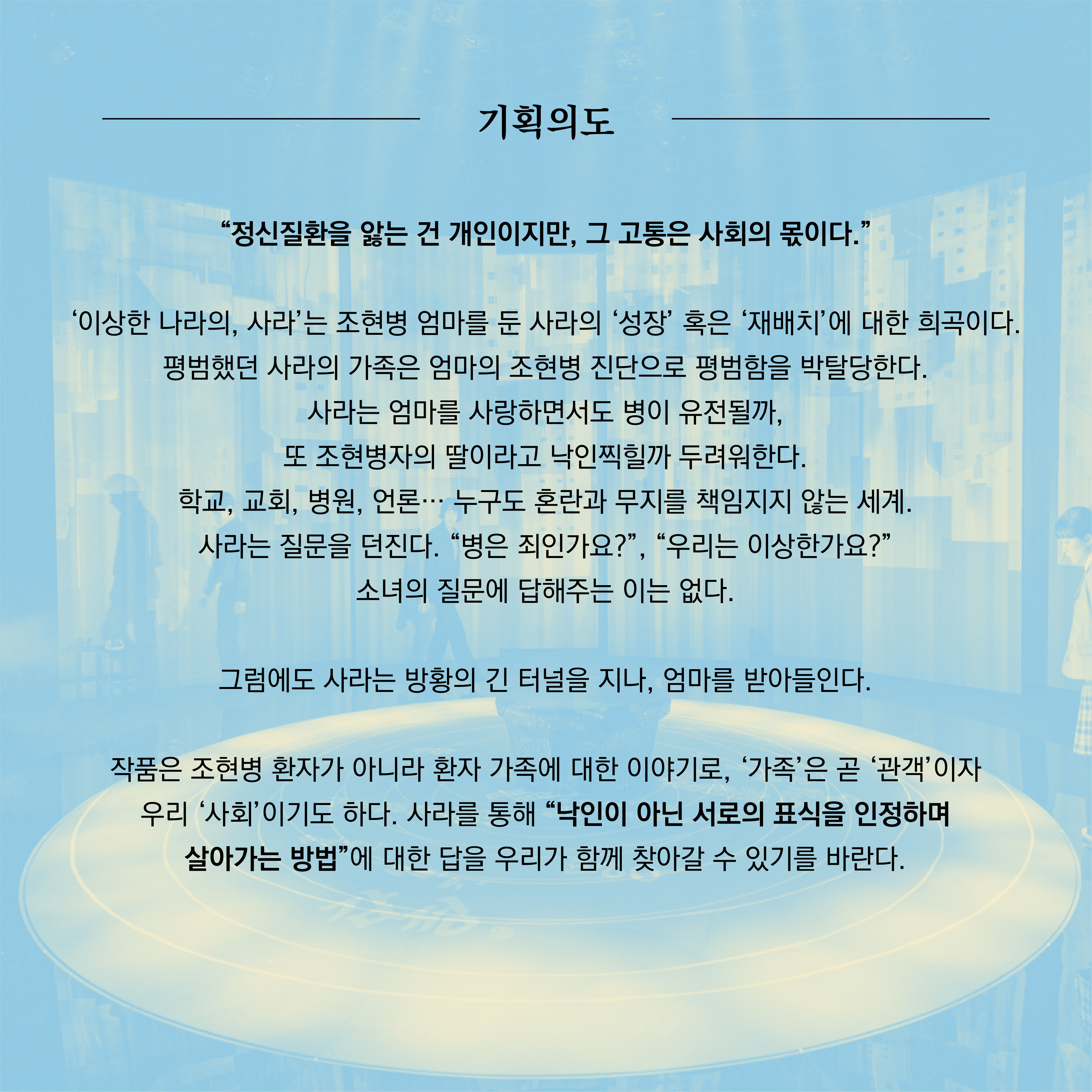 ‘이상한 나라의, 사라’는 조현병 엄마를 둔 사라의 ‘성장’ 혹은 ‘재배치’에 대한 희곡이다. 평범했던 사라의 가족은 엄마의 조현병 진단으로 평범함을 박탈당한다. 사라는 엄마를 사랑하면서도 병이 유전될까, 또 조현병자의 딸이라고 낙인찍힐까 두려워한다. 학교, 교회, 병원, 언론… 누구도 혼란과 무지를 책임지지 않는 세계. 사라는 질문을 던진다. “병은 죄인가요?”, “우리는 이상한가요?” 소녀의 질문에 답해주는 이는 없다.