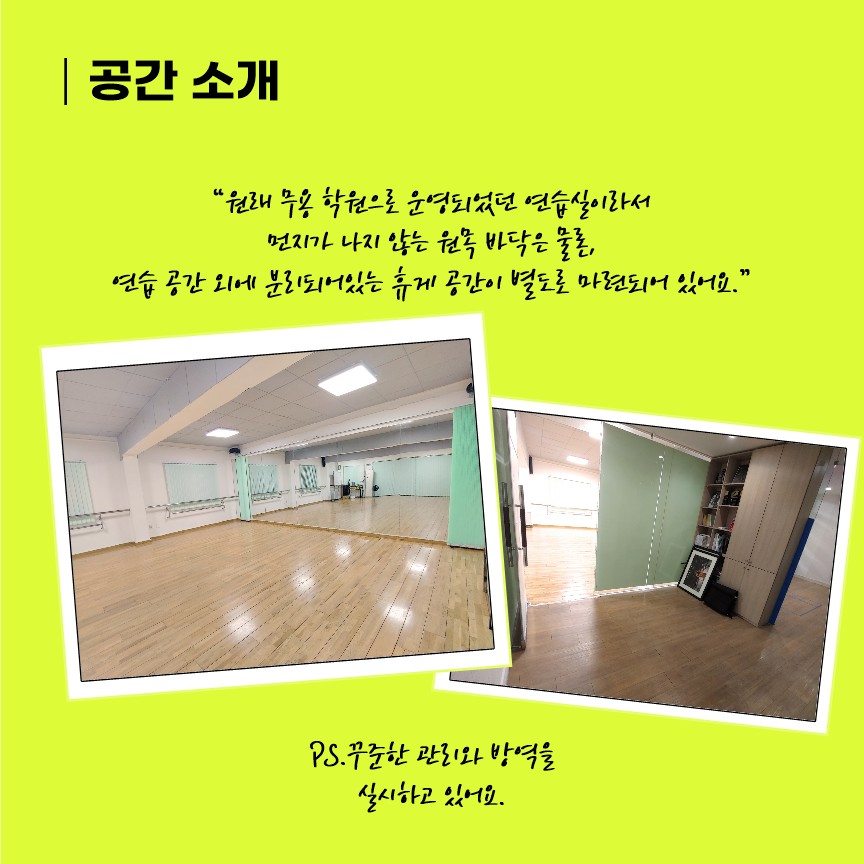 원래 무용 학원으로 운영되었던 연습실이라서 먼지가 나지 않는 원목 바닥은 물론, 연습 공간 외에 분리되어 있는 휴게 공간이 별도로 마련되어 있어요.
