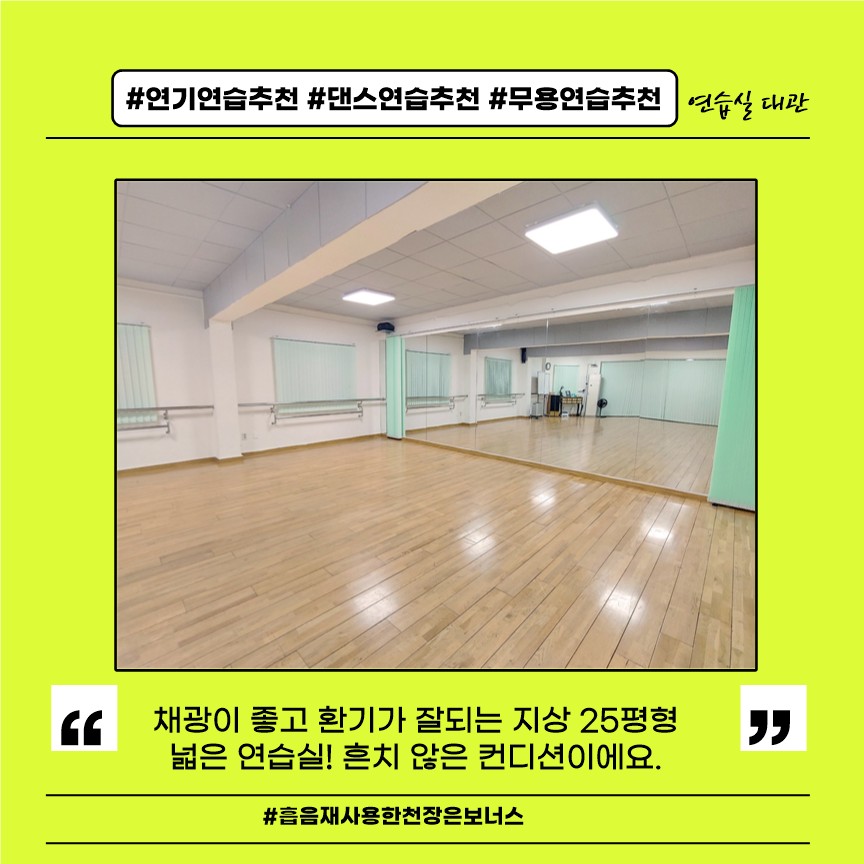 “채광이 좋고 환기가 잘 되는 지상 25평형 넓은 연습실! 흔치 않은 컨디션이에요.”