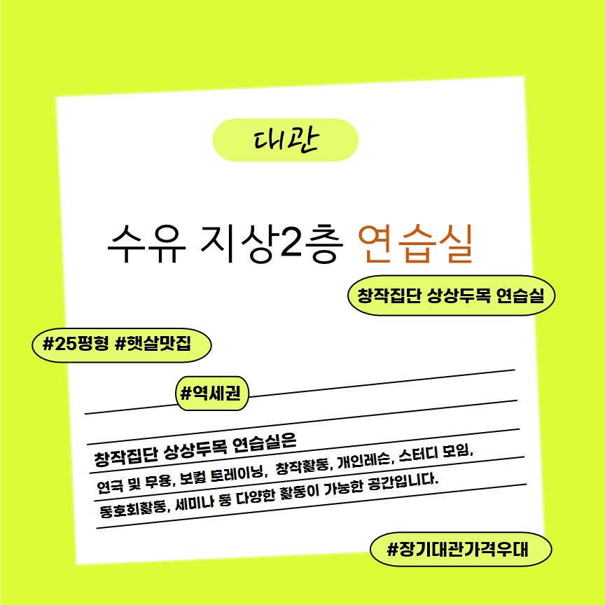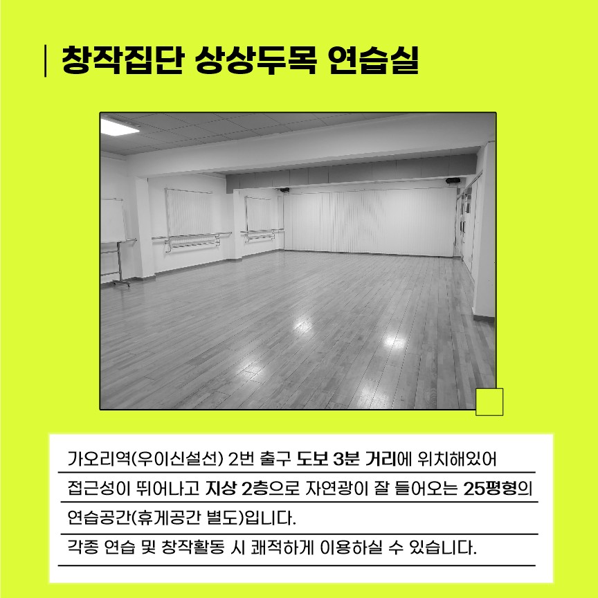 #창작집단상상두목연습실 #25평형 #햇살맛집 #역세권 #장기대관가격우대 #연습실대관