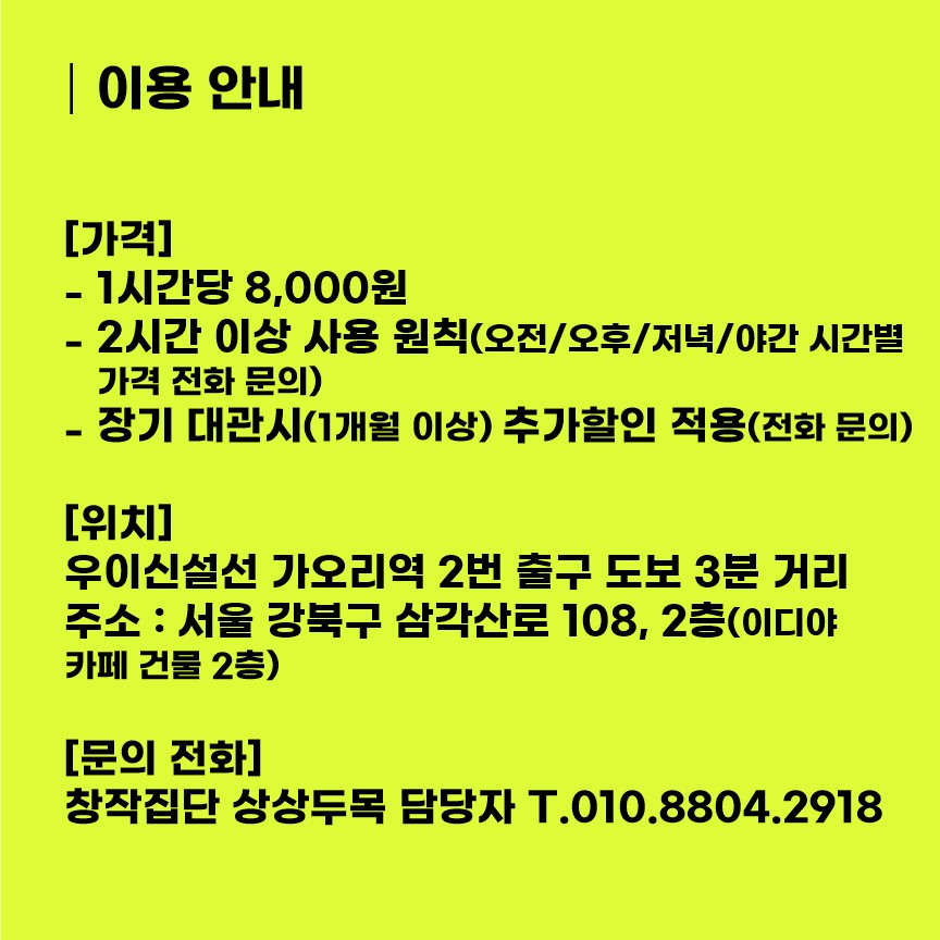 상상두목과 탄력적으로 대관 시간을 조율하시면 대관료 절충도 가능합니다.