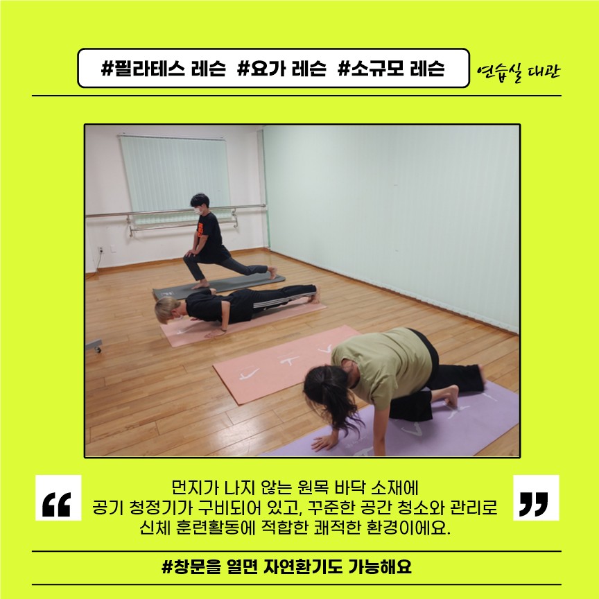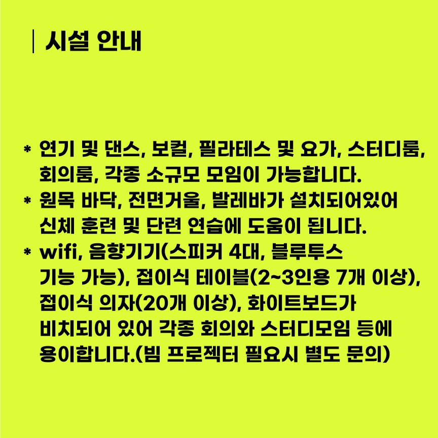 연기 및 댄스, 보컬, 필라테스 및 요가, 스터디룸, 회의룸, 각종 소규모 모임이 가능합니다.